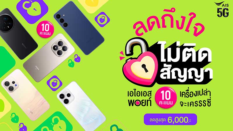 ซื้อมือถือเครื่องเปล่าที่ AIS คุ้มไม่ไหว! “ลดถึงใจ ไม่ติดสัญญา” เพียงใช้เอไอเอส พอยท์ 10 คะแนน รับส่วนลดสูงสุด 6,000 บาท!