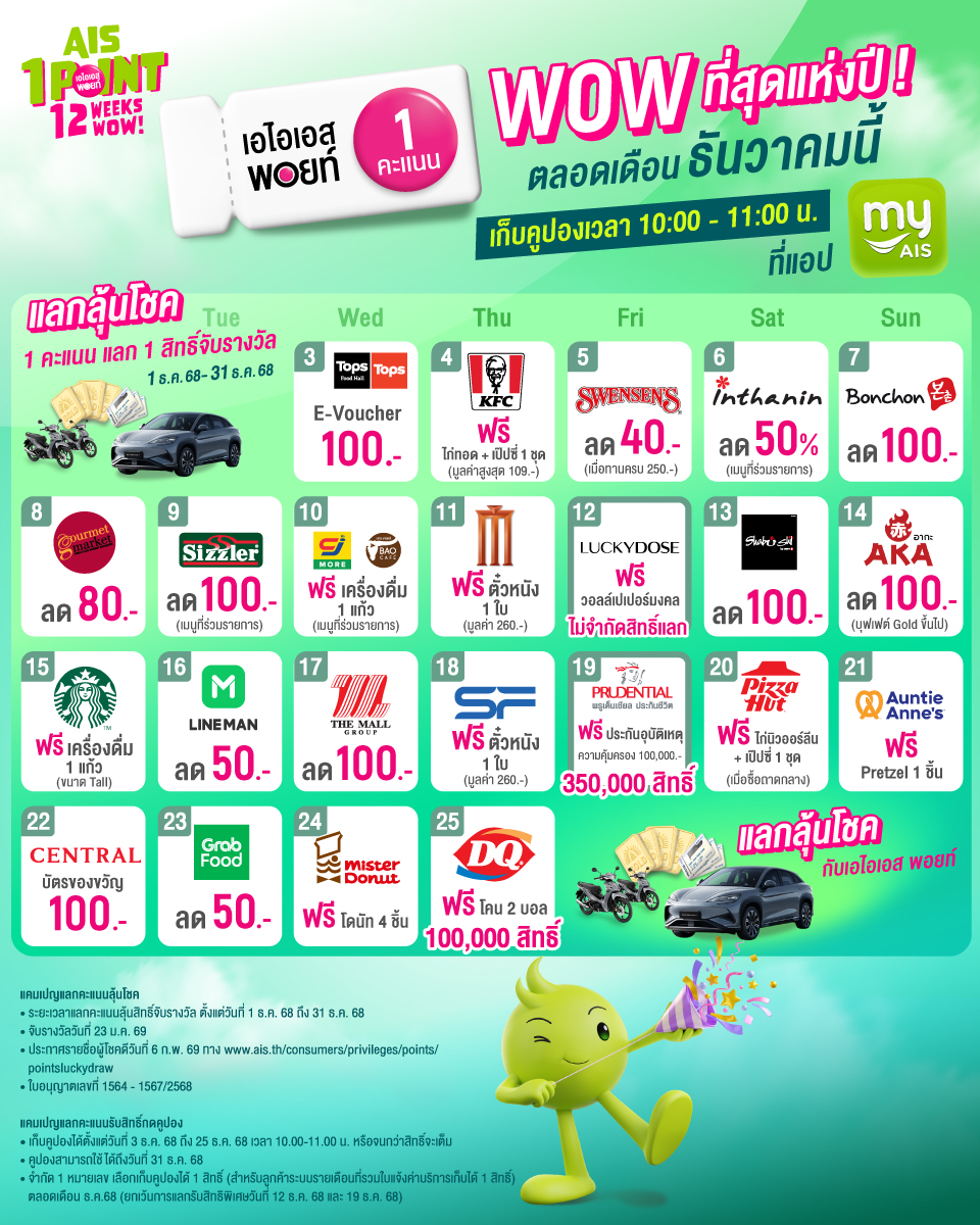 AIS ฉลองครบรอบ 35 ปี กับแคมเปญใหญ่ “AIS 1 POINT 12 WEEKS 12 WOW!” พร้อมยกระดับเดือนธันวาคมให้เป็นเดือนแห่งความสุขส่งท้ายปี ด้วยการมอบความสุขสุดว้าวให้ลูกค้า AIS ทุกคน จัดเต็มดีลสุดว้าว เอาใจสายกิน ดื่ม ช้อปปิ้ง ตอบโจทย์ทุกไลฟ์สไตล์ ตลอดทุกวันถึงสิ้นปี เพียงใช้ เอไอเอส พอยท์ 1 คะแนน ก็สามารถลุ้นโชครางวัลใหญ่ พร้อมแลกรับคูปองส่วนลด จากแบรนด์ชั้นนำกว่า 20 แบรนด์ได้ทันที ผ่านแอป myAIS โดยแบ่งความว้าวออกเป็น 4 ต่อ ดังนี้