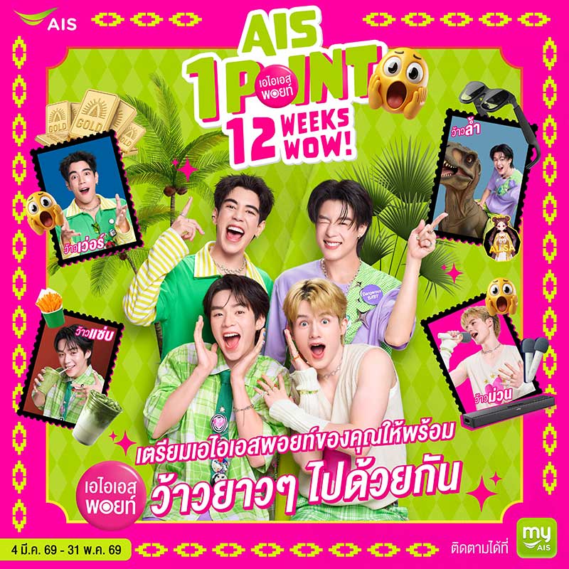 AIS มอบความสุขแทนคำขอบคุณลูกค้าที่อยู่เคียงข้างกันมาตลอด 36 ปี AIS จึงขอเติมเต็มช่วงเวลาแห่งความสุขยิ่งกว่าเคยให้ลูกค้า เดินหน้าส่งต่อความสุขครั้งใหญ่ผ่านแคมเปญสุดพิเศษ “AIS 1 POINT 12 WEEKS 12 WOW!” มอบประสบการณ์ความว้าวต่อเนื่องตลอด 12 สัปดาห์ ระหว่างเดือนมีนาคม 2569 - พฤษภาคม 2569 ให้ลูกค้า AIS ร่วมสนุกง่ายๆ เพียงใช้เอไอเอส พอยท์ 1 คะแนน แลกสิทธิ์ลุ้นรับของรางวัลสุดเอ็กซ์คลูซีฟรวม 12 ความว้าว ครอบคลุมทั้งไลฟ์สไตล์ เทคโนโลยี ท่องเที่ยว และความบันเทิง ผ่านแอปพลิเคชัน myAIS ยิ่งร่วมสนุกมาก ยิ่งเพิ่มโอกาสความว้าวมากขึ้น โดยมีรางวัลสุดว้าวมาเสิร์ฟให้เพียบ ไม่ว่าจะเป็นแลกรับ Potato Corner แลกรับคูปองเติมน้ำมัน แลกรับชุดความบันเทิงในบ้าน Smart Soundbar พร้อม Wireless Microphone แลกรับประกันอุบัติเหตุ พร้อมค่ารักษาพยาบาล แลกรับแพ็กเกจ Alisa Ai ใช้ฟรี 1 เดือน รวมไปถึง ว้าวสุดยิ่งใหญ่ ใช้เอไอเอส พอยท์ 1 คะแนน แลกสิทธิ์ลุ้น Lucky Draw รับทอง รวมมูลค่ากว่า 2,000,000 บาท เริ่มแลกสิทธิ์ได้ตั้งแต่ 4 มี.ค. 69 – 31 มี.ค. 69 ยิ่งแลกมาก ยิ่งมีสิทธิ์มาก ตอกย้ำความคุ้มค่าแบบว้าวกว่าเดิม เตรียมสร้างปรากฏการณ์ความตื่นเต้นแบบจัดเต็มตลอดแคมเปญอย่างแน่นอน