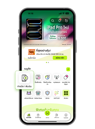 1. เข้าใช้งานแอป myAIS ​แล้วเลือกเมนูจ่ายบิล/เติมเงิน