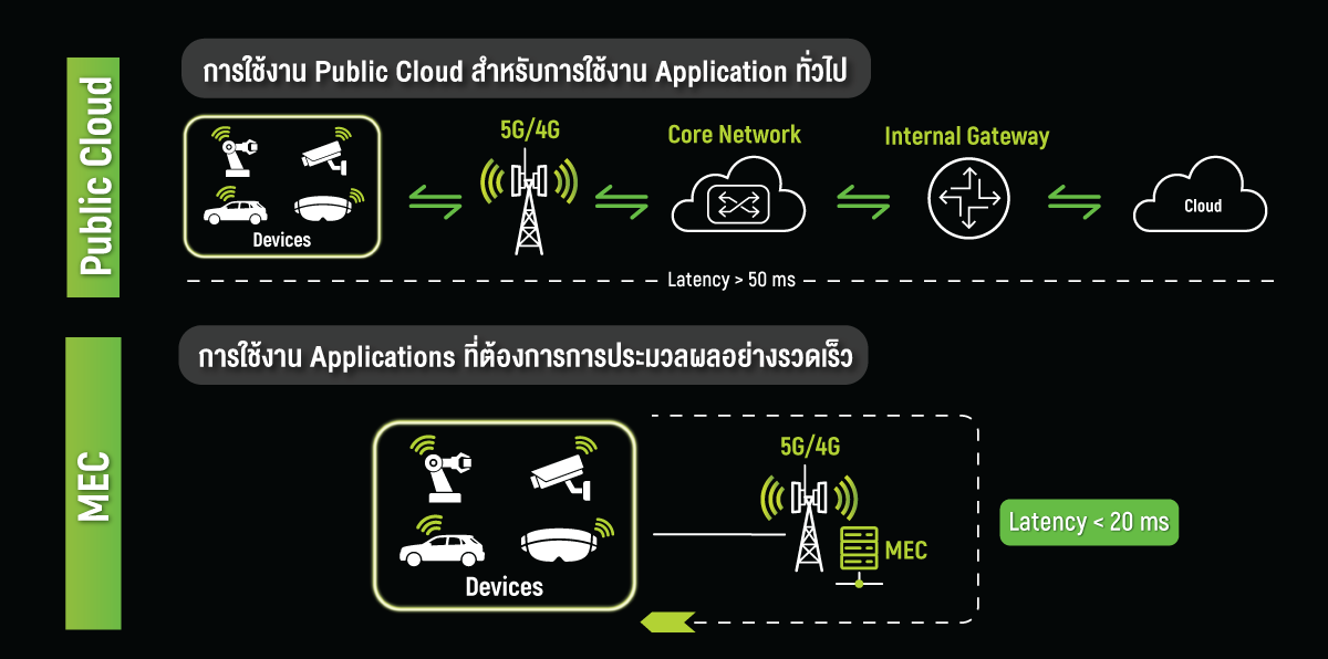จะเห็นได้ว่า เมื่อระบบหรือ Application ใช้งานอยู่บน Public Cloud ทั่วไป การส่งข้อมูลนอกจากการเชื่อมต่อผ่านเครือข่ายที่ใช้งานแล้ว ยังต้องผ่านระบบต่างๆของเครือข่ายไปจนถึงการออกอินเทอร์เน็ต แล้วถึงจะสามารถส่งข้อมูลไปยัง Public Cloud ที่ใช้งานได้ ซึ่งจะส่งผลต่อความล่าช้า หรือ latency ที่เกิดขึ้น มีความล่าช้ามากกว่าการใช้งาน MEC การใช้งาน Cloud ทั่วไปจึงเหมาะกับระบบหรือApplication ที่ใช้สำหรับการเก็บข้อมูล หรือการประมวลผลที่ไม่จำเป็นการ response ต่อผู้ใช้งานแบบ real-time