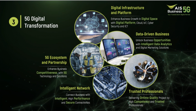 ปัจจัยสำคัญที่ทำให้ AIS Business ก้าวขึ้นมาพร้อมเป็นผู้ช่วยธุรกิจในการทำ Digital Transformation ให้สำเร็จได้นั้น คือ การขยายความร่วมมือ AIS 5G กับพันธมิตรผู้เชี่ยวชาญในอุตสาหกรรมต่าง ๆ อย่างต่อเนื่อง เพื่อสร้าง 5G Ecosystem ที่แข็งแรง ขยายขีดความสามารถในการต่อยอดผลิตภัณฑ์และส่งมอบโซลูชัน AIS 5G แบบครบวงจรสู่การทรานส์ฟอร์มองค์กรให้แก่ลูกค้าทั้งภาครัฐ ภาคธุรกิจ และภาคอุตสาหกรรม