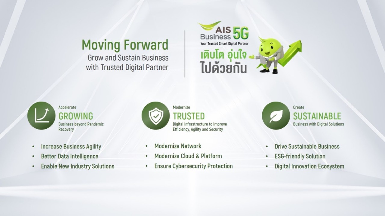 ด้วยความมุ่งมั่นตั้งใจของ AIS Business ประกอบกับความพร้อมในฐานะผู้ให้บริการโครงข่ายอัจฉริยะ 5G อันดับ 1 ของไทย ทำให้เราพร้อมเป็นพันธมิตรดิจิทัล ที่มั่นใจได้ เพื่อพัฒนาธุรกิจและสังคมไทยเติบโตอย่างยั่งยืนไปด้วยกัน ในมิติต่างๆ ดังนี้