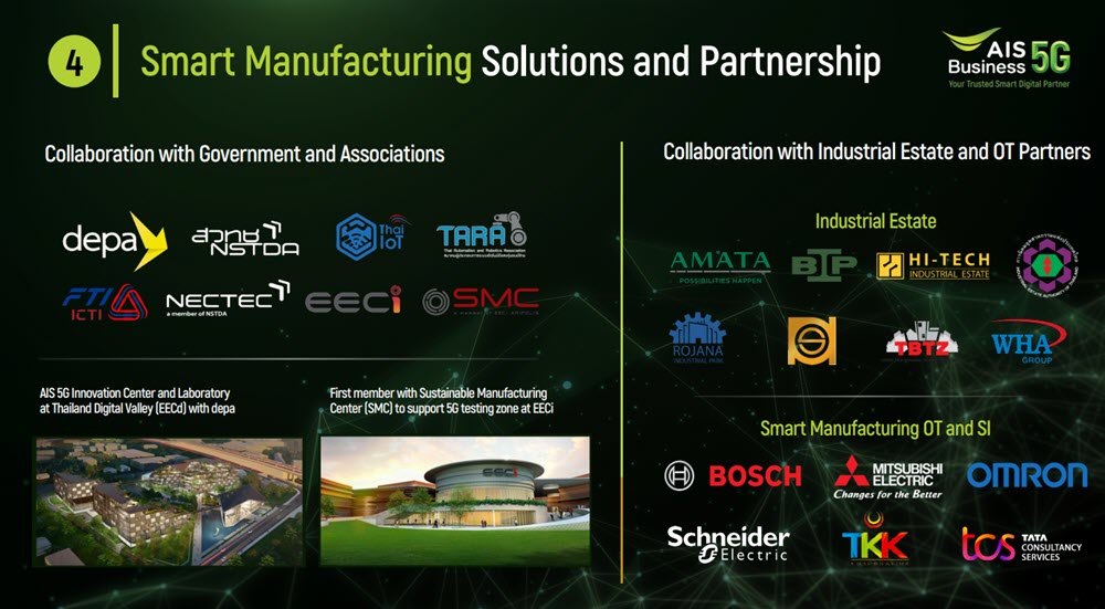 ด้วยเหตุนี้เอง AIS จึงได้จับมือกับพันธมิตรในภาคอุตสาหกรรมการผลิตที่แต่ละคนต่างมีเอกลักษณ์ในมุมเฉพาะตัว ที่เชี่ยวชาญในพาร์ทของเครื่องจักร ซอฟต์แวร์ ระบบควบคุม ตลอดจนส่วนประกอบต่างๆในภาคอุตสาหกรรม ทั้ง Bosch, Mitsubishi Electric, Omron, Schneider Electric, TKK และ TCS หรือกรณีของความร่วมมือกับสมาคมผู้ประกอบการระบบอัตโนมัติและหุ่นยนต์ไทย (TARA) ในการนำหุ่นยนต์บนการเชื่อมต่อ 5G มาใช้เชิงพาณิชย์แห่งแรกในประเทศไทย และยังมีอีกหลายการใช้งานที่แสดงให้เห็นว่าอุตสาหกรรมการผลิตนั้นสามารถนำระบบมาใช้งานบนโครงข่าย 5G ได้จริง