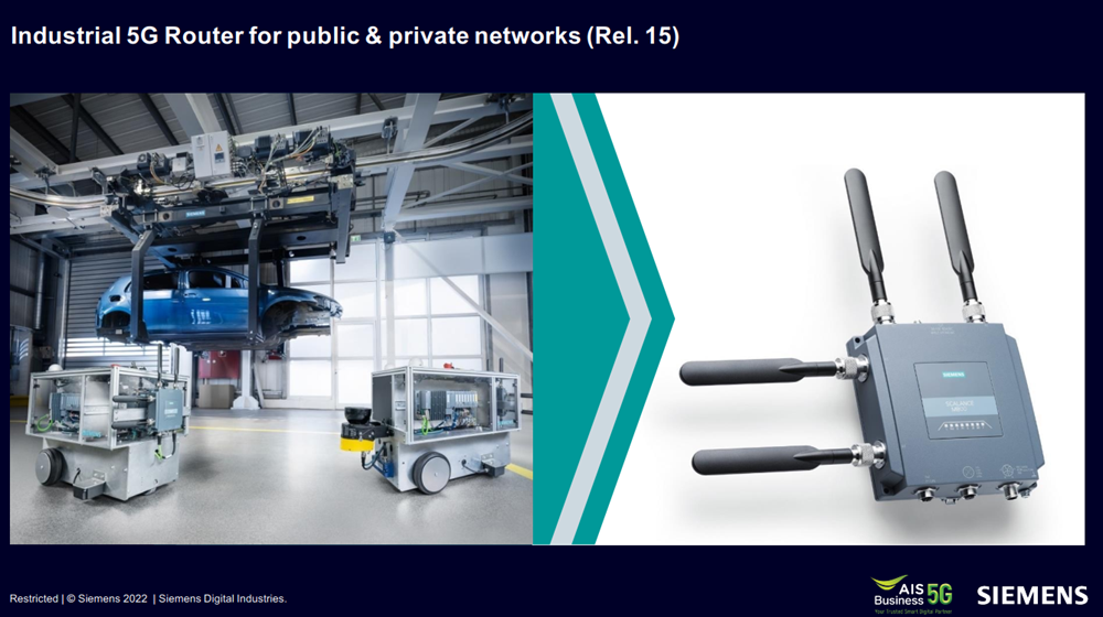 อีกหนึ่งไฮไลต์ที่ SIEMENS ได้นำเสนอในงานครั้งนี้ก็คือการเปิดตัว 5G Industrial Router ที่รองรับมาตรฐานทางอุตสาหกรรมตัวแรกในประเทศไทยและเป็นประเทศที่ 4 ในโลกที่ได้มีโอกาสสัมผัสกับอุปกรณ์นี้ สาเหตุที่ต้องมี Router ชนิดทนทานเป็นพิเศษเพราะสภาพแวดล้อมของโรงงานอุตสาหกรรมนั้นมีความยากกว่าปกติเช่น ความร้อน ความชื้น หรือสารเคมีต่างๆ และนี่คือการเปิดโอกาสให้ระบบ OT สามารถเชื่อมต่อกับ IT ผ่าน 5G ได้อย่างสมบูรณ์
