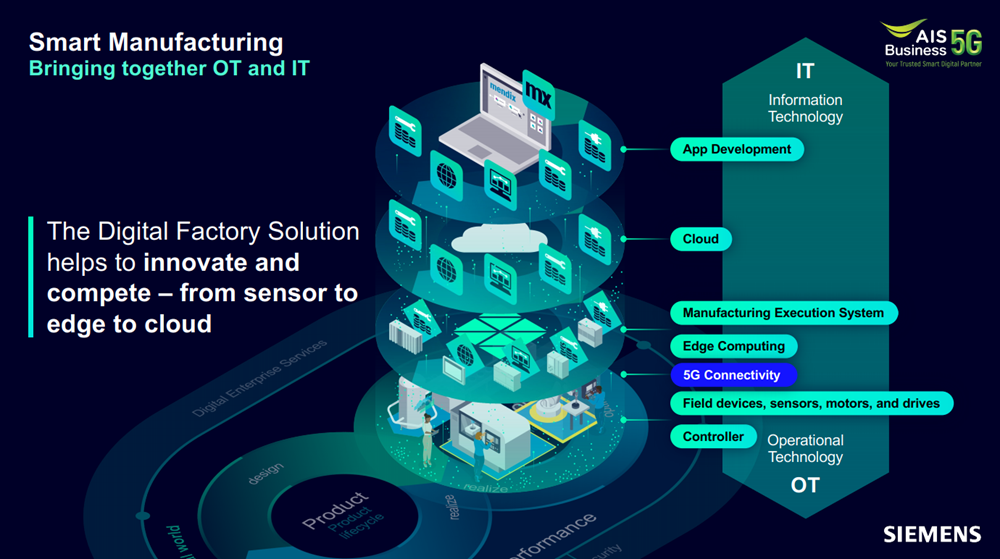 ล่าสุดในงาน Thailand 5G Summit 2022 ทาง AIS ได้มีการเปิดตัวพาร์ทเนอร์รายใหญ่ในทางอุตสาหกรรมอย่าง SIEMENS ที่หลายท่านคงคุ้นชื่อกันเป็นอย่างดี โดย SIEMENS เป็นบริษัทที่มีชื่อเสียงระดับโลกมายาวนานในฟิลด์ของระบบโครงสร้างพื้นฐานขนาดใหญ่ ซึ่งในส่วนของ Smart Manufacturing ทางบริษัทก็เป็นผู้นำและโซลูชันสำหรับด้านการผลิต เช่น ซอฟต์แวร์ที่ช่วยออกแบบไลน์การผลิตให้เกิดขึ้นได้อย่างมีประสิทธิภาพมากที่สุด โดยปกติแล้วหากใครเคยทำงานในโรงงานอาจเคยเห็นการเปลี่ยนแปลงโยกย้ายแปลนเครื่องจักรนั้น ซึ่งมีต้นทุนสูงมากเพราะต้องปิดพื้นที่เพื่อปรับเปลี่ยนการทำงาน ที่กระทบทั้งเรื่องกายภาพและระบบเชื่อมต่อผ่าน LAN หรือ Wi-Fi อีกด้วย