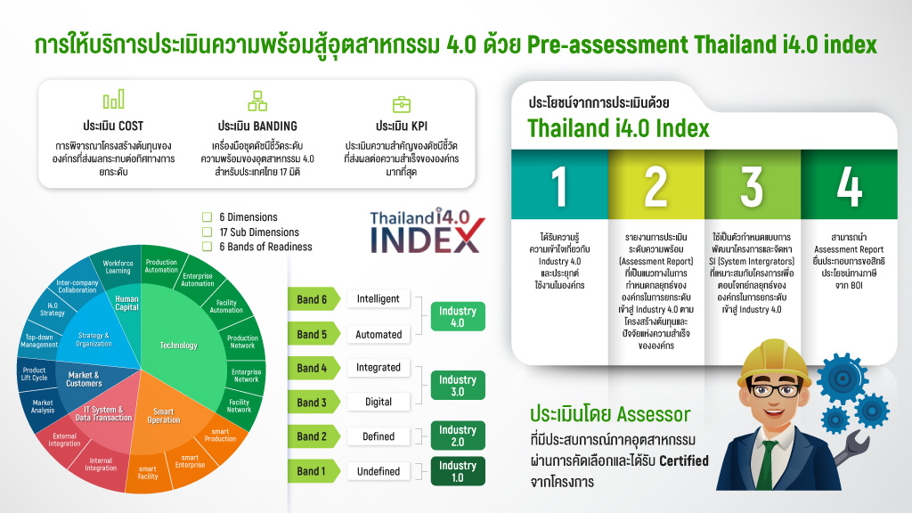 1. ตรวจสอบสถานะปัจจุบันของโรงงานอุตสาหกรรมโดยผู้เชี่ยวชาญ และผลักดันให้เกิดการดำเนินธุรกิจให้ผ่านรับรอง การตรวจสอบ และการประเมิน Thailand i4.0 Index ซึ่งจะเป็นหลักประกันให้กับความพร้อมและศักยภาพของตัวธุรกิจเอง
