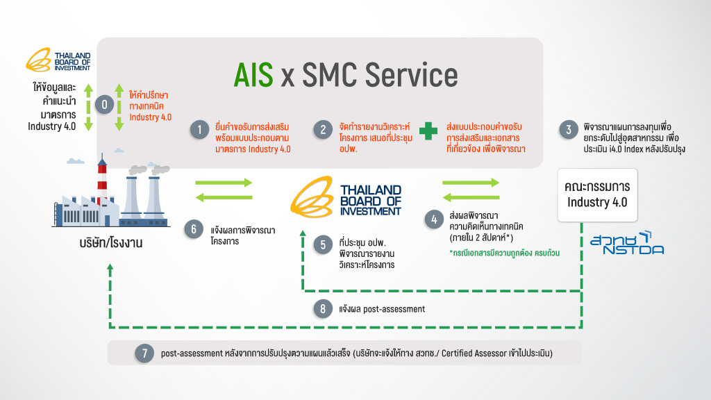 AIS Business 5G เข้าใจดีว่าผู้ประกอบการอาจจะไม่ทราบถึงสิทธิประโยชน์ หรืออาจจะคาดไม่ถึงในขั้นตอนรายละเอียดต่าง ๆ จึงได้เกิดเป็นความร่วมมือกับ SMC เพื่อทำให้ผู้ประกอบการสามารถเกิด Transformation ในการผลิตขึ้นได้ด้วยการสนับสนุนที่สอดคล้องกับนโยบายต่าง ๆ โดยเฉพาะอย่างยิ่งการแก้ปัญหาเรื่องการลงทุนซึ่งเป็นกำแพงหลักที่ทำให้ผู้ประกอบการจำนวนไม่น้อยต้องหยุดชะงักและพับแผนการพัฒนาต่าง ๆ ลง