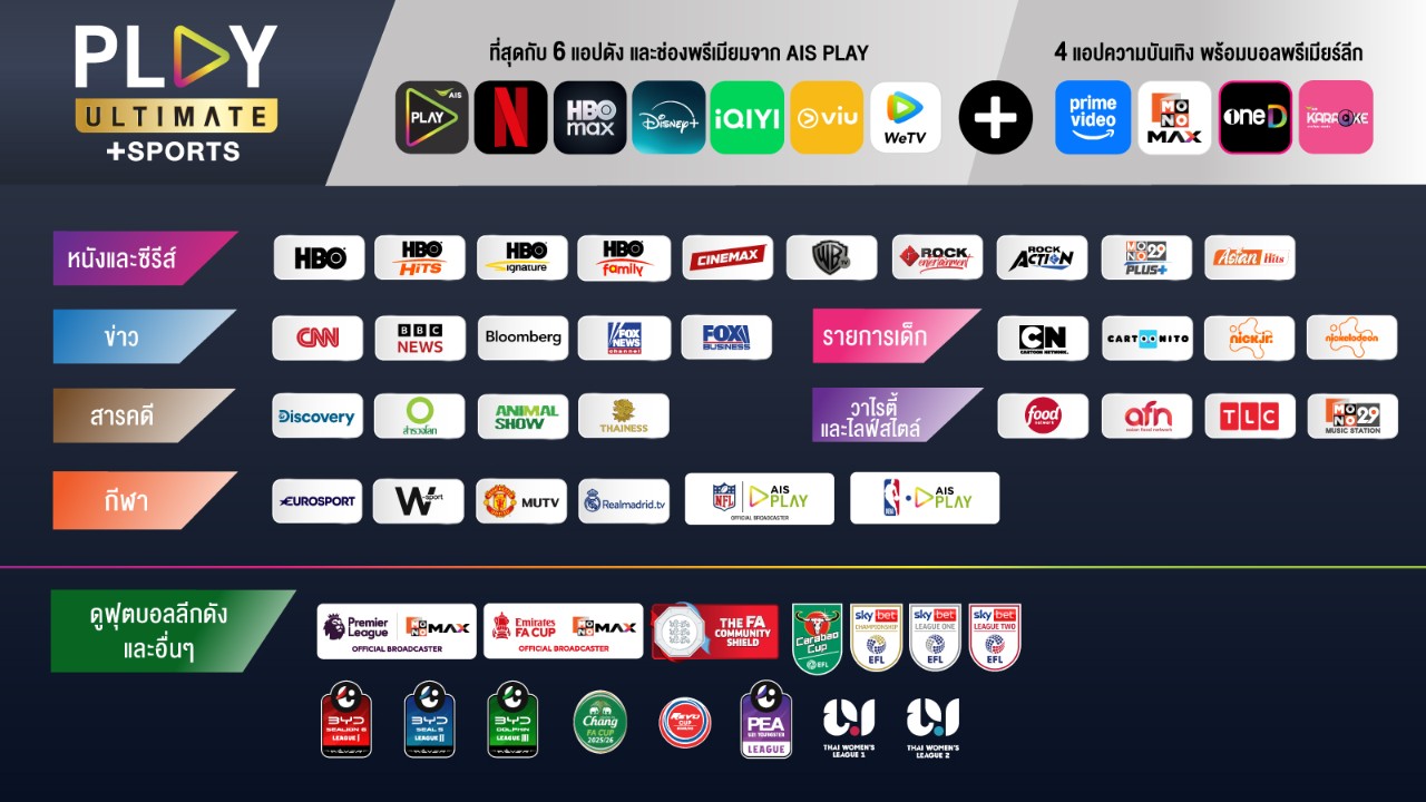 - รับสิทธิ์ชมแอปพลิเคชัน NETFLIX, HBO Max, Disney+ Hotstar, iQIYI, Viu และ WeTV จากแพ็กเกจ PLAY ULTIMATE โดยไม่มีค่าใช้จ่ายเพิ่ม