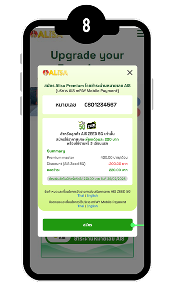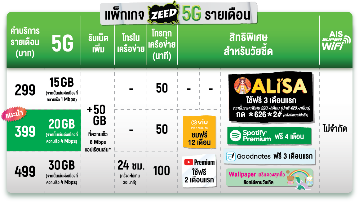เงื่อนไขการจัดรายการส่งเสริมการขาย เปิดเบอร์ใหม่หรือย้ายค่าย ZEED 5G พร้อมสมัครแพ็กเกจรายเดือน 299 บาทขึ้นไป สามารถสมัครใช้งาน Alisa Premium รับสิทธิ์ใช้งานฟรี 3 เดือนแรก จากนั้นชำระค่าบริการเพียงเดือนละ 220 บาท (ปกติราคาเดือนละ 420 บาท) ราคารวม VAT เป็นระยะเวลา 12 เดือน เมื่อสมัครผ่าน USSD *626*2# โทรออก ภายใน 30 วันนับจากวันที่ได้รับ SMS แจ้งสิทธิ์สมัครใช้งาน Alisa Premium และชำระเงินผ่านบริการ AIS mPAY Mobile Payment