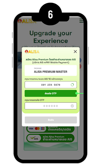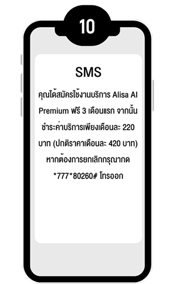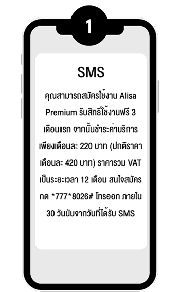 กด USSD *626*2# โทรออก ภายใน 30 วัน หลังได้รับ SMS แจ้งสิทธิ์ จากนั้นยืนยันการสมัครใช้งาน Alisa Premium ผ่านแอป LINE ด้วย OTP