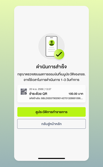 6. เมื่อเติมเงินสำเร็จ หน้าจอจะแสดง “ดำเนินการสำเร็จ” คุณสามารถตรวจสอบยอดเงินออม 1-3 วันทำการ ที่เมนูลัด “ออมเงินกับกอช.” ที่หน้าหลักใน myAIS app