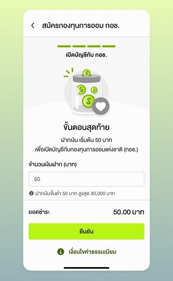 8. ฝากเงินเพื่อเปิดบัญชีกับกอช. ใส่จำนวนเงินที่ต้องการออม เริ่มต้น 50 บาท สูงสุดไม่เกิน 30,000 บาท/ปี จากนั้นกด “ยืนยัน”