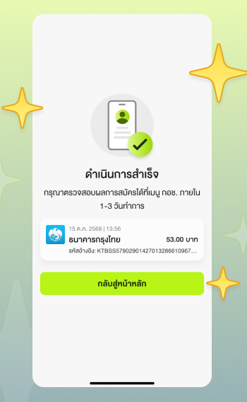 9. เมื่อสมัครสำเร็จ หน้าจอจะแสดง “ดำเนินการสำเร็จ” คุณสามารถตรวจสอบผลการสมัคร 1-3 วันทำการ ที่เมนูลัด “ออมเงินกับกอช.” ที่หน้าหลักใน myAIS app