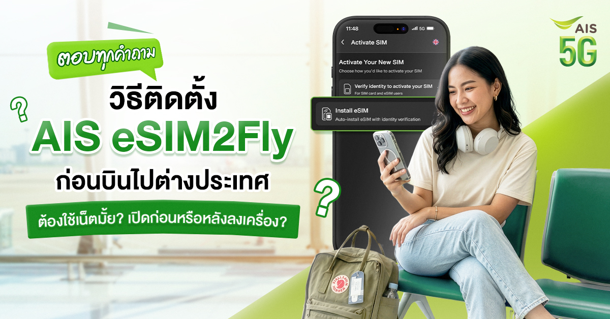 ติดตั้ง AIS eSIM2Fly ต้องใช้อินเทอร์เน็ตหรือ WiFi ในการสแกน QR Code แนะนำให้ติดตั้งก่อนขึ้นเครื่อง เพื่อให้ถึงต่างประเทศใช้งานได้ทันที โดยแพ็กเกจจะเริ่มนับเมื่อจับสัญญาณครั้งแรก