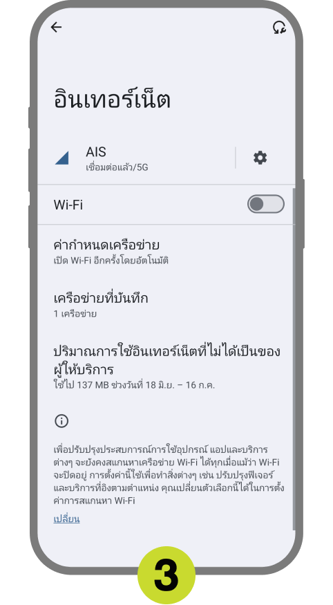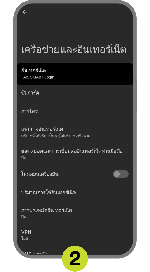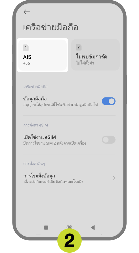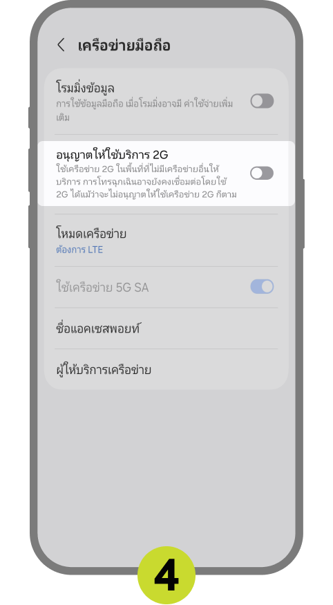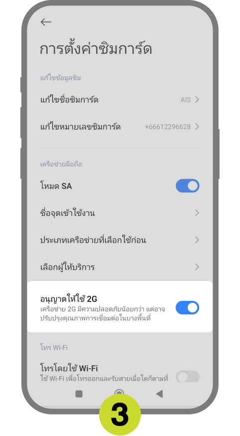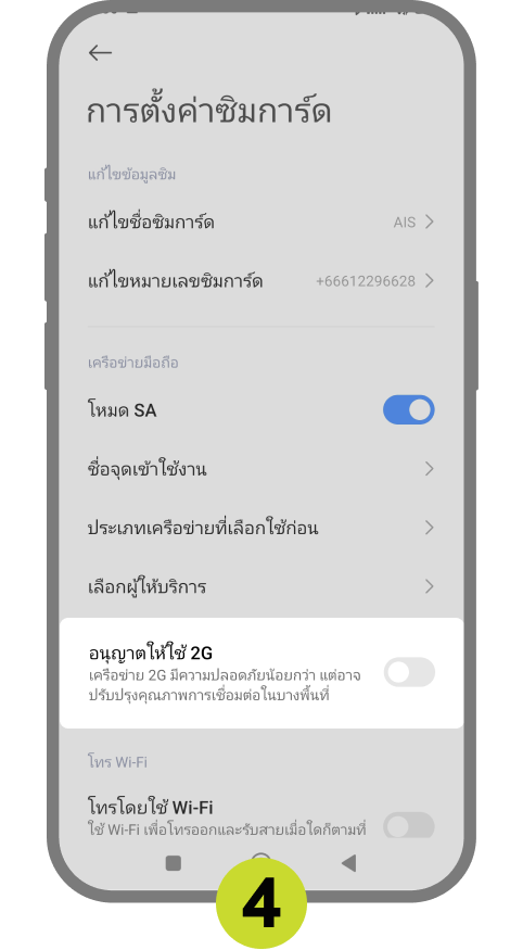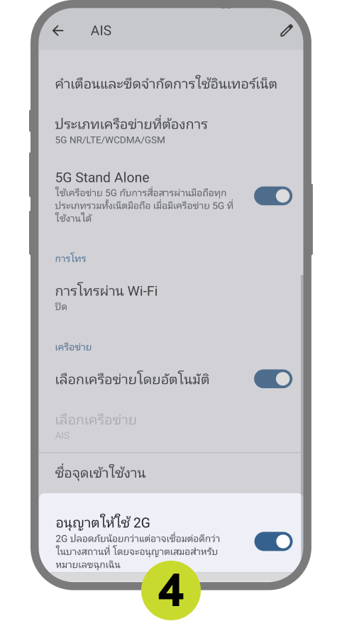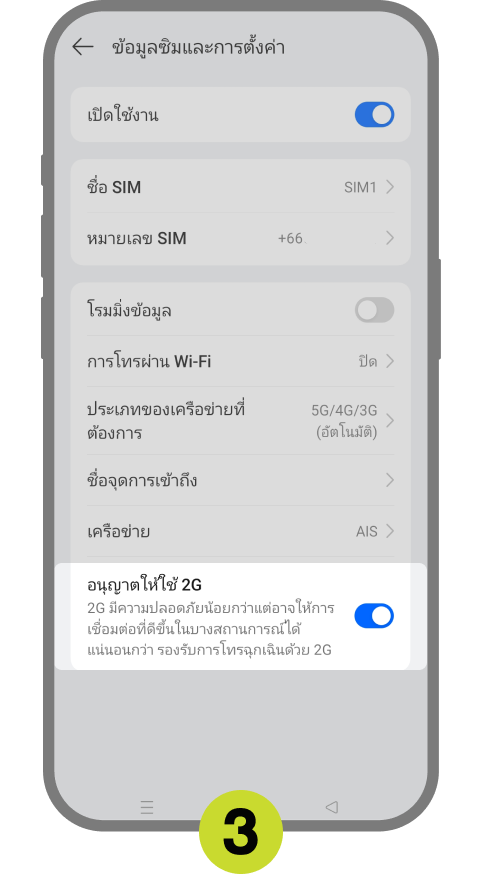 TH: การตั้งค่า > เครือข่ายและอินเทอร์เน็ต > ซิม > AIS > อนุญาตให้ใช้ 2G > ปิดการเชื่อมต่อ 2G