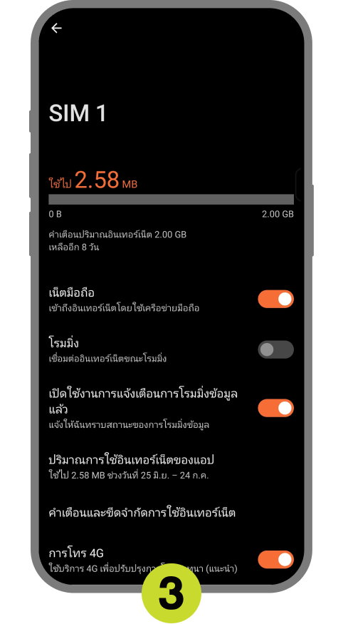 TH: การตั้งค่า > เครือข่ายโทรศัพท์มือถือ > ซิม1 หรือซิม2 > อนุญาตให้ใช้ 2G > ปิดการเชื่อมต่ 2G