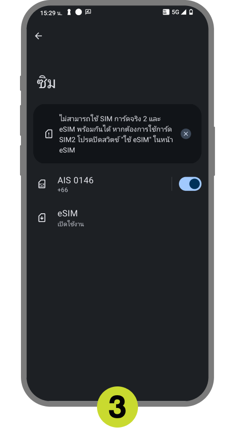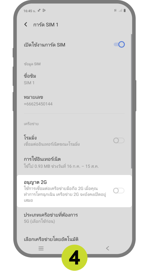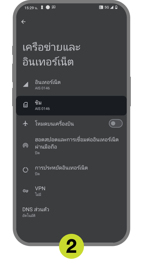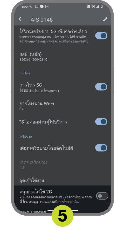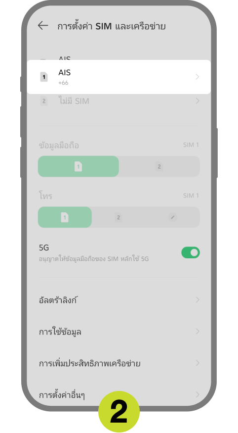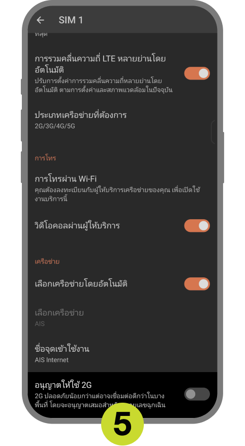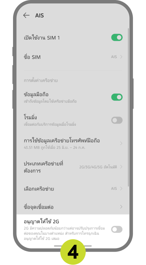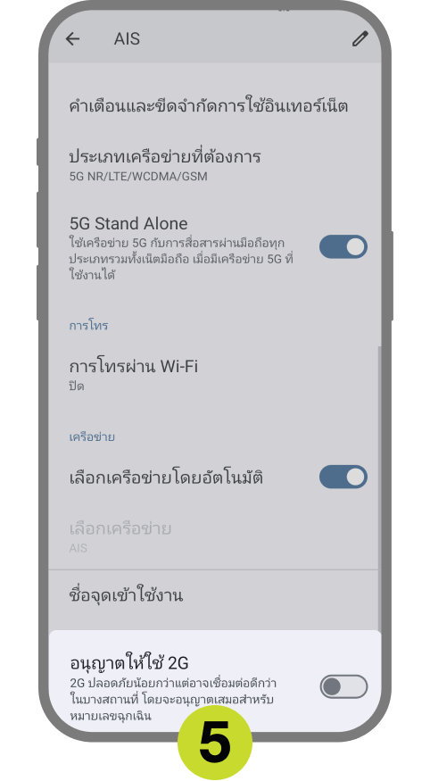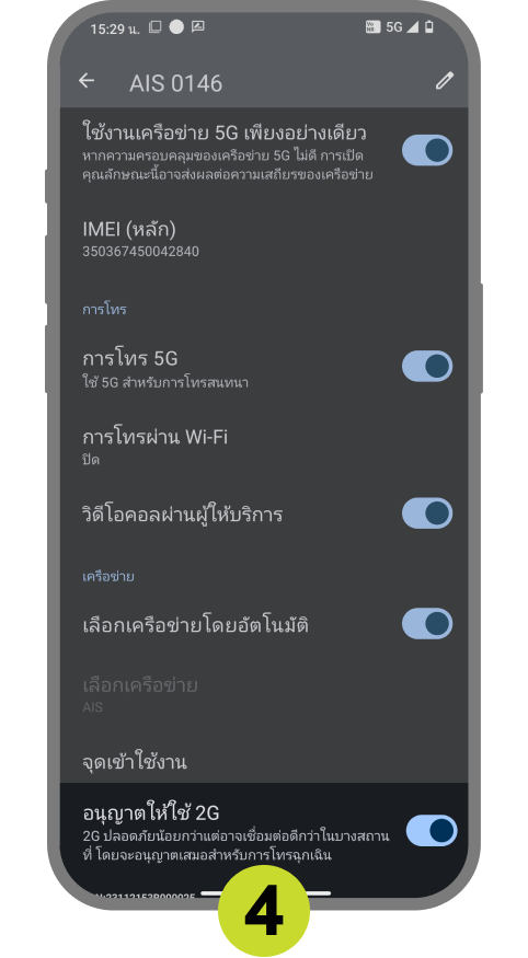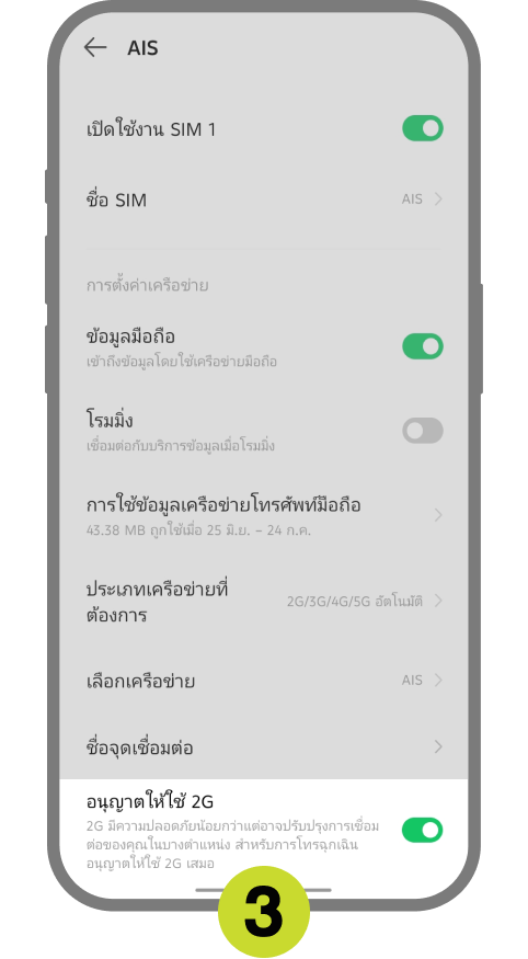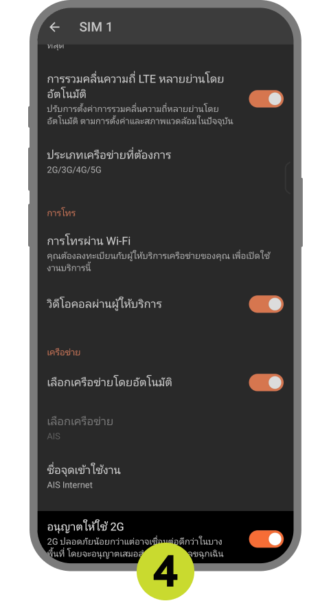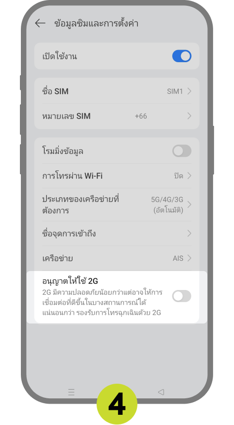TH: การตั้งค่า > เครือข่ายและะอินเทอร์เน็ต > ซิม >AIS > อนุญาตให้ใช้ 2G > ปิดการเชื่อมต่อ 2G