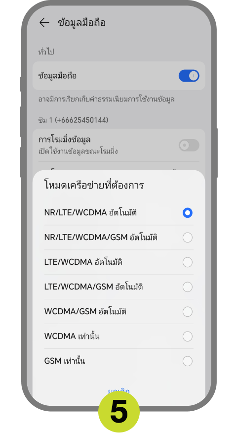 TH: การตั้งค่า > เครือข่ายโทรศัพท์มือถือ > ข้อมูลมือถือ > โหมดเครือข่ายที่ต้องการ > NR/LTE/WCDMA อัตโนมัติ