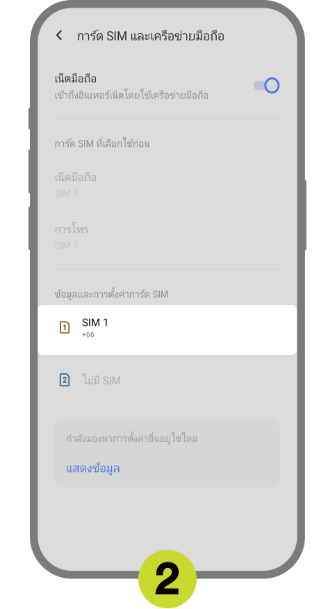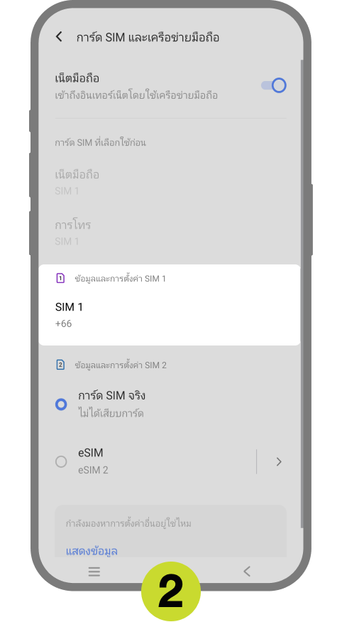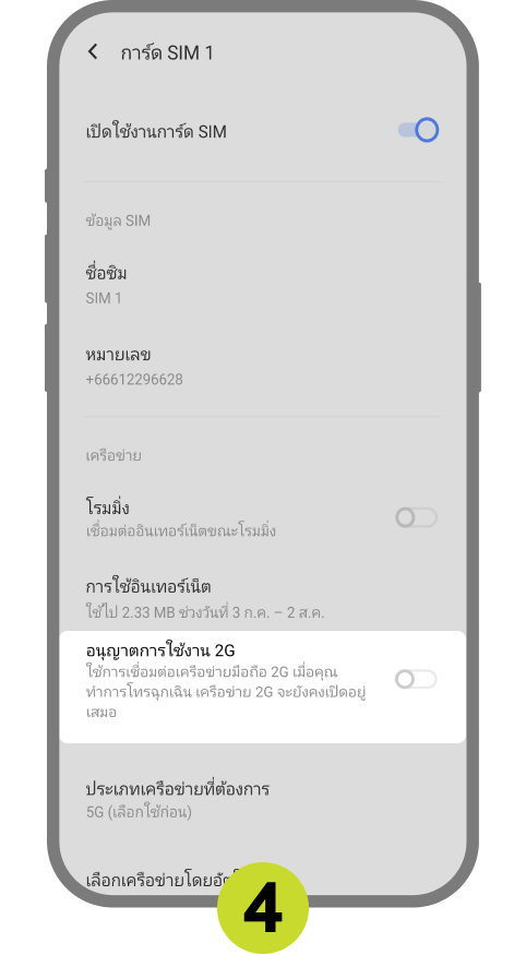 TH: การตั้งค่า > ซิมและเครือข่าย > SIM1 หรือ SIM2 > อนุญาตให้ใช้ 2G > ปิดการเชื่อมต่อ 2G