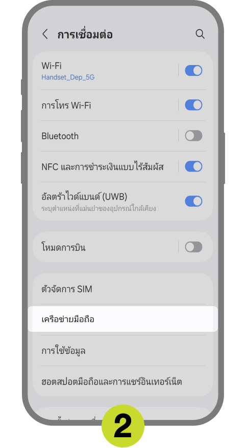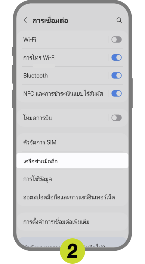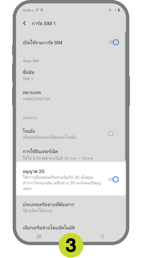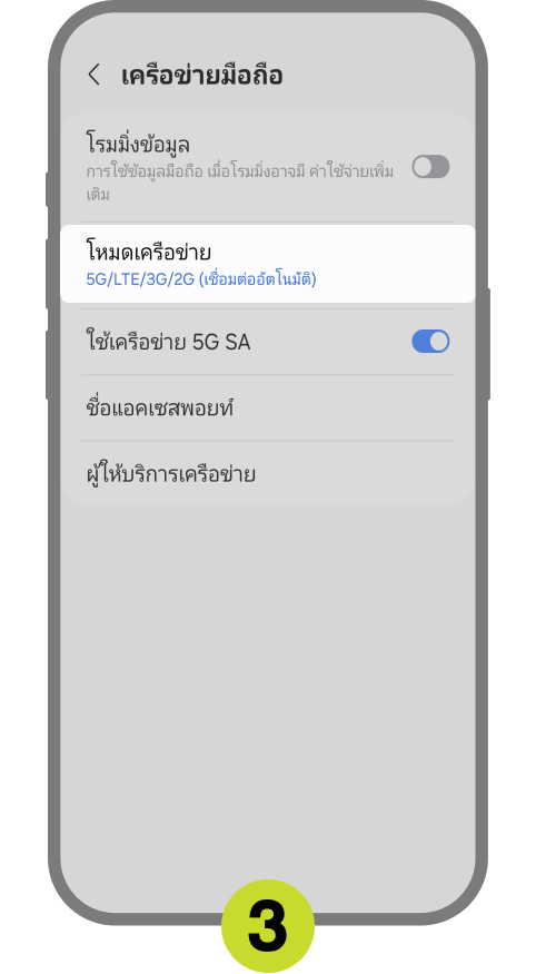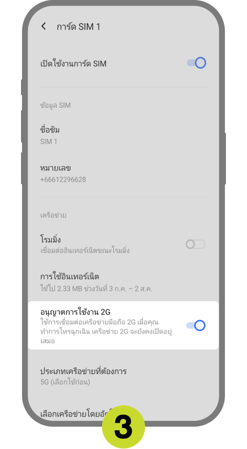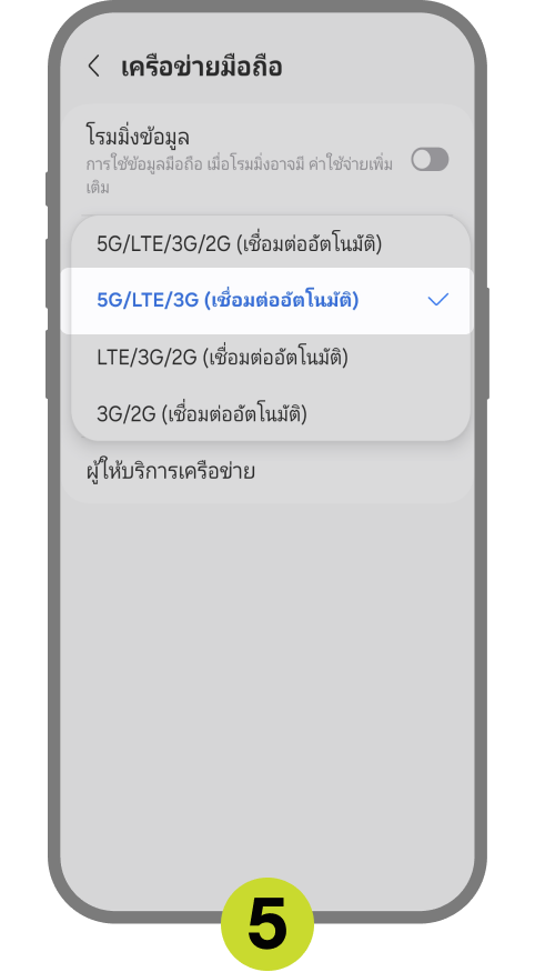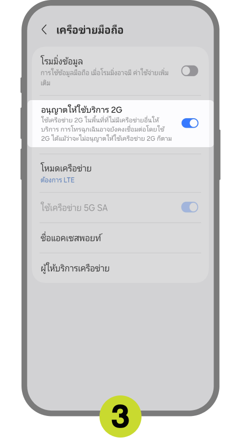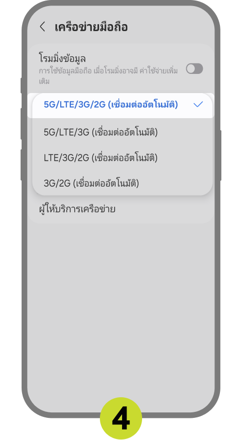 TH: กการตั้งค่า > การเชื่อมต่อ > เครือข่ายมือถือ > อนุญาตให้ใช้บริการ 2G > 5G/LTE/3G (เชื่อมต่ออัตโนมัติ)