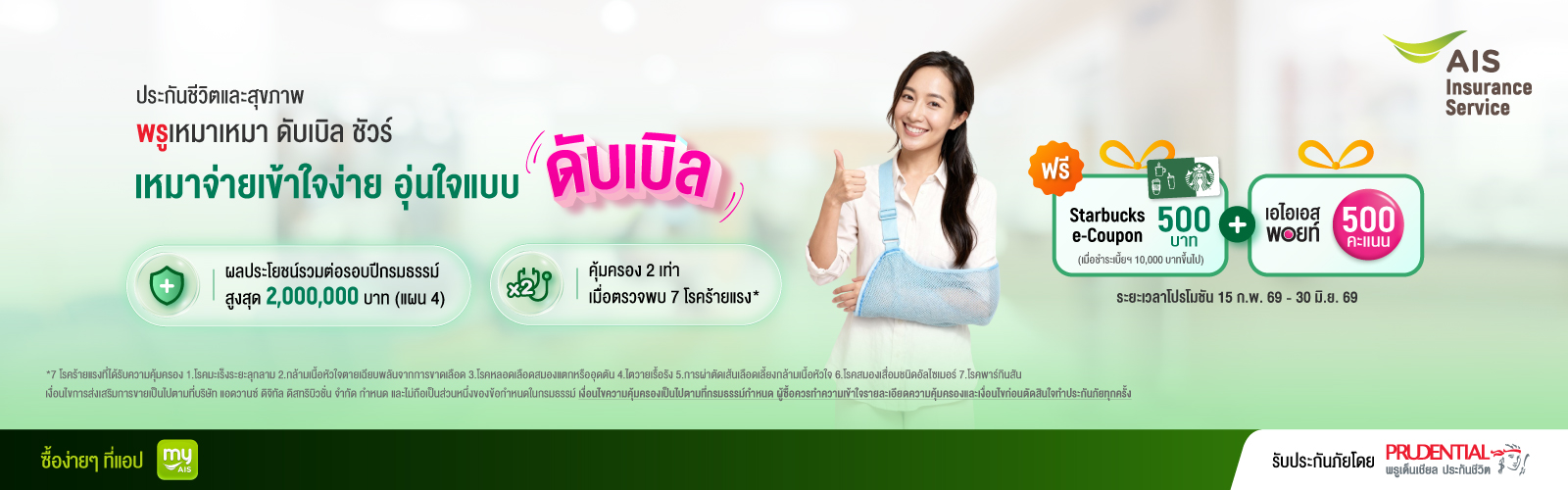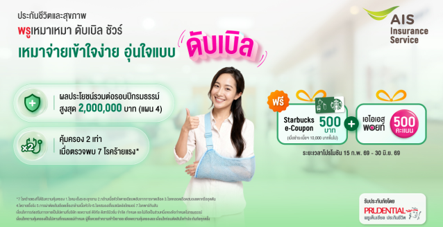 สิทธิพิเศษ เมื่อซื้อประกันชีวิตและสุขภาพพรู เหมาเหมา ดับเบิล ชัวร์ รับ Starbucks e-Coupon มูลค่า 500 บาท(เมื่อชำระเบี้ยฯ 10,000 บาทขึ้นไป) พิเศษ! ลูกค้า AIS รับ AIS Points 500 คะแนน/กรมธรรม์