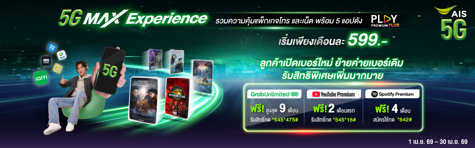 พิเศษสำหรับลูกค้าที่สมัครแพ็กเกจ 5G Max UNLIMITED และ 5G Serenade Exclusive Plan 1,199 ขึ้นไป รับสิทธิ์เปิดเบอร์เพิ่ม แพ็กเกจพิเศษ AIS 5G Net SIM ค่าบริการรายเดือนเพียง 199 บาท เน็ต 5G เต็มสปีด 30 GB พร้อมใช้ต่อเนื่องไม่จำกัด ความเร็วสูงสุด 1 Mbps และ AIS Super WiFi ไม่จำกัด นาน 12 รอบบิล