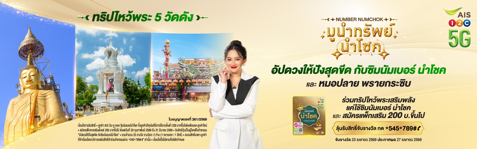 12. จับรางวัล“อัปดวงให้ปังสุดขีด กับซิมนัมเบอร์นำโชค” ในวันที่ 23 เมษายน 2569 และประกาศผลในวันที่ 27 เมษายน 2569 โดยจับรางวัลที่ บริษัท แอดวานซ์ ไวร์เลส เน็ทเวอร์ค จำกัด อาคารเอไอเอส 1, 414 ถ. พหลโยธิน แขวงสามเสนใน เขตพญาไท กรุงเทพมหานคร 10400 และประกาศผลเวลา 17.00 น. ผ่านเว็บไซต์ นัมเบอร์นำโชค (https://www.ais.th/consumers/package/exclusive-plan/lucky-number/number-numchok) โดยมีเจ้าหน้าที่โทรติดต่อไปยังผู้โชคดีตามหมายเลขโทรศัพท์ตามที่จับรางวัลได้ เพื่อแจ้งรายละเอียด ขอทราบชื่อ-นามสกุลของผู้โชคดี เพื่อตรวจสอบข้อมูล ตรวจสอบสิทธิ์ก่อนประกาศอย่างเป็นทางการ