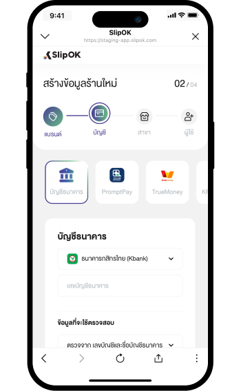 5. เลือกบัญชีร้านค้าที่จะใช้ตรวจสอบการรับเงิน และกดสร้างบัญชี (บัญชี, พร้อมเพย์, True Money, Kshop, แม่มณี)