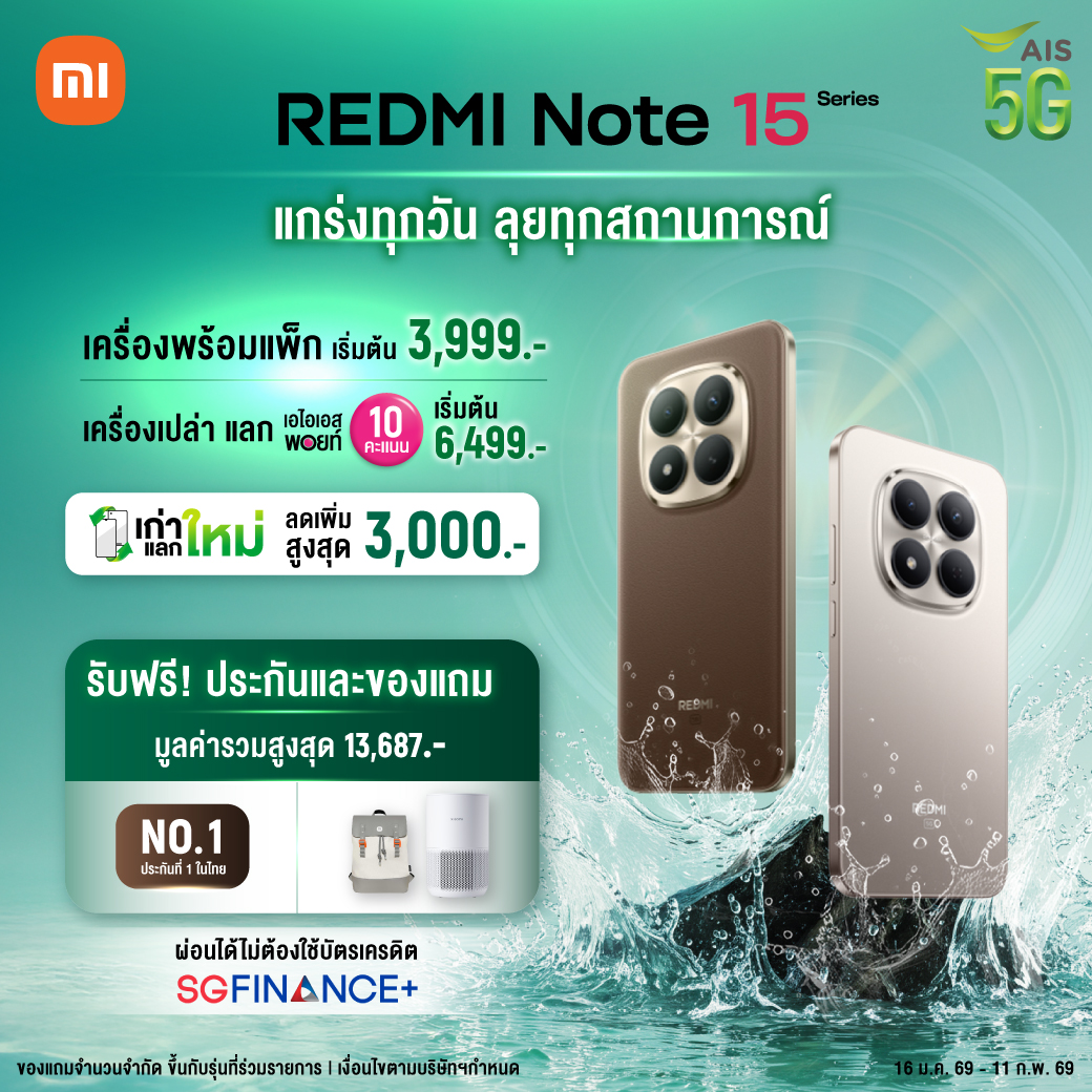 Redmi Note 15 Series โปร ใช้ AIS Points แลกรับส่วนลดสูงสุด 1,000 บาท หรือใช้แลกส่วนลดซื้อสมาร์ทโฟนสูงสุดถึง 5,000 บาท พร้อมรับพอยท์เพิ่มทุกการช้อป