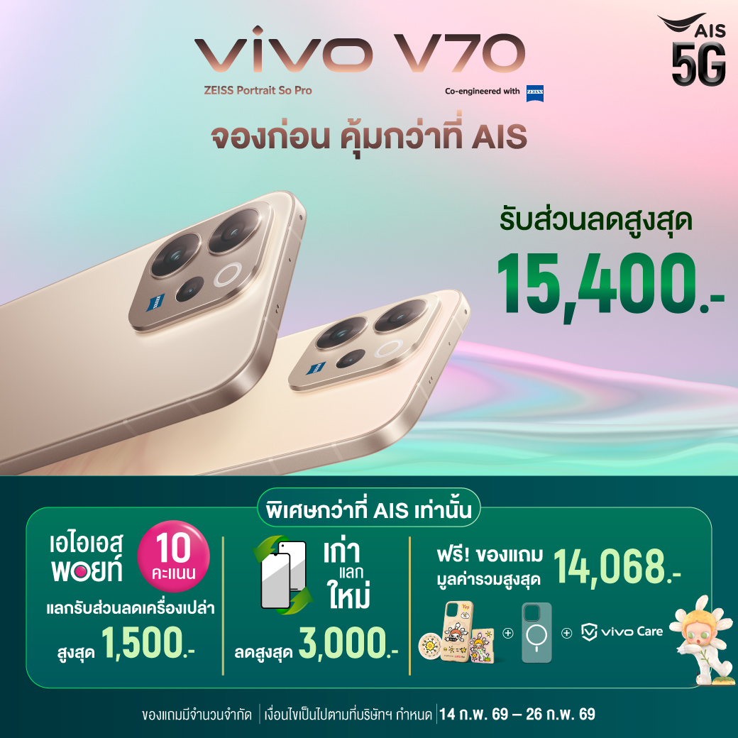 คุ้มกว่าใคร! สั่งจอง vivo V70 กล้อง ZEISS Portrait ที่ AIS รับส่วนลดรวมสูงสุด 15,400.- ใช้เพียง 10 พอยท์ลดเพิ่ม 1,500.- พร้อมรับฟรีของแถมและ vivo Care มูลค่า 14,068.-
