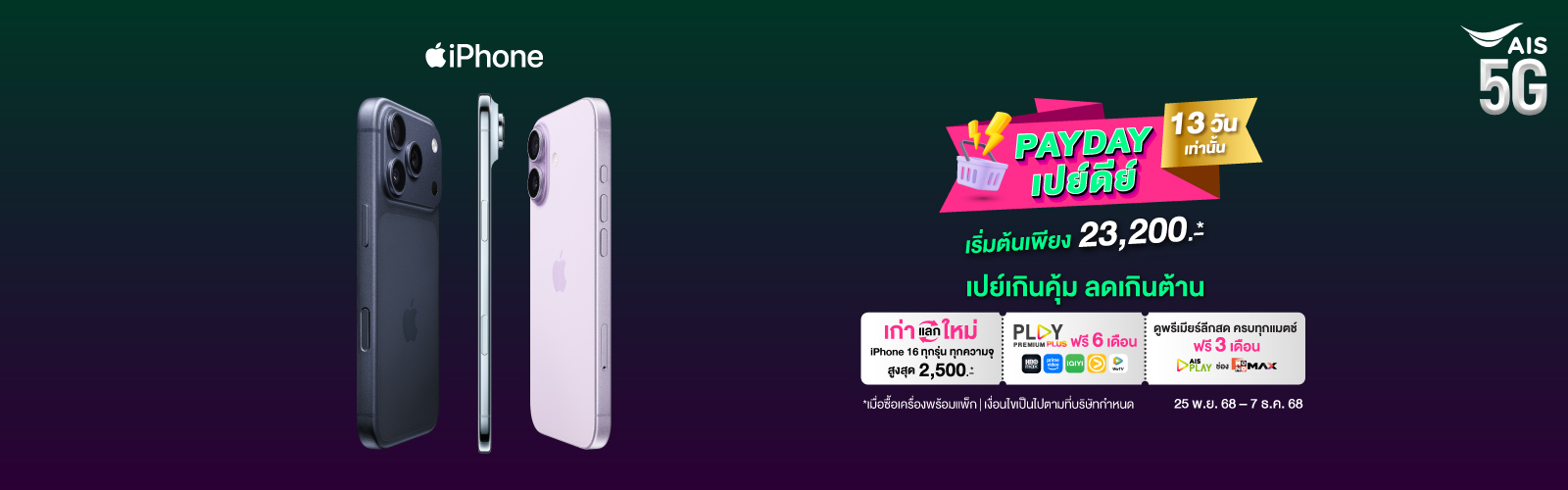 สำหรับ ลูกค้า AIS รายเดือนซื้อเครื่อง iPhone 17 Pro Max, iPhone 17 Pro, iPhone 17 และ iPhone Air ระหว่างวันที่ 25 พ.ย.- 7 ธ.ค. 2568