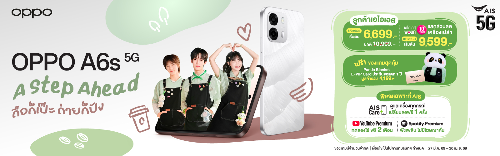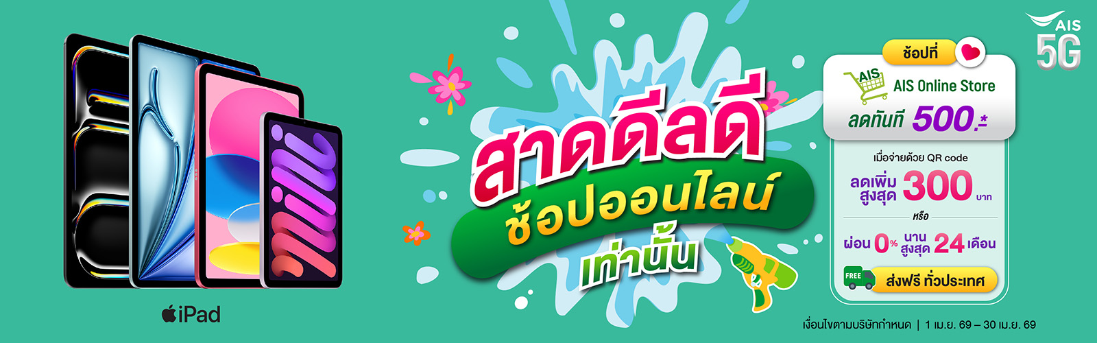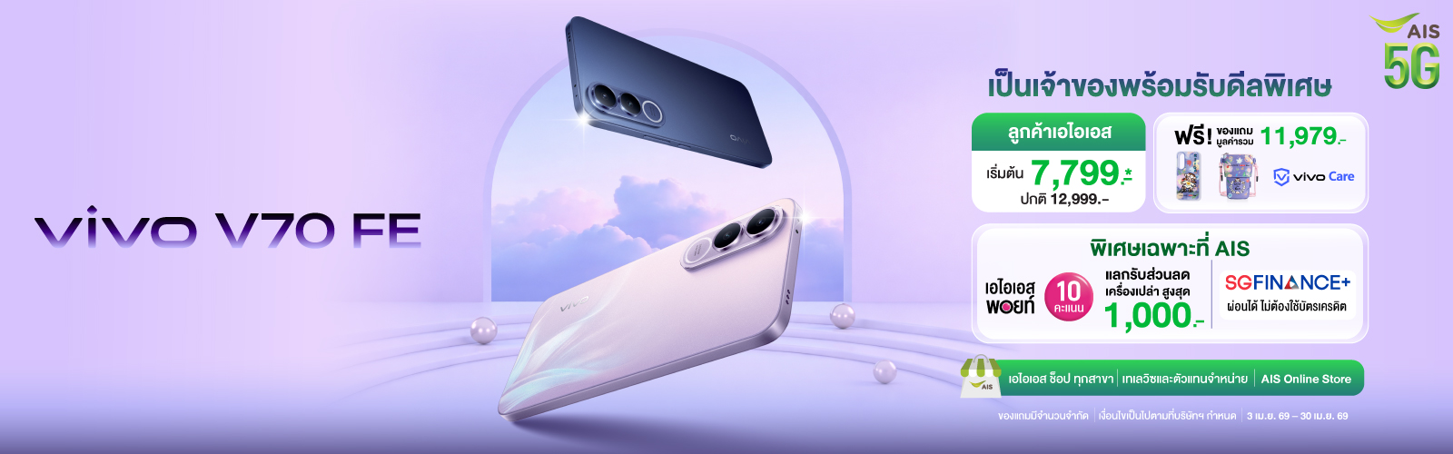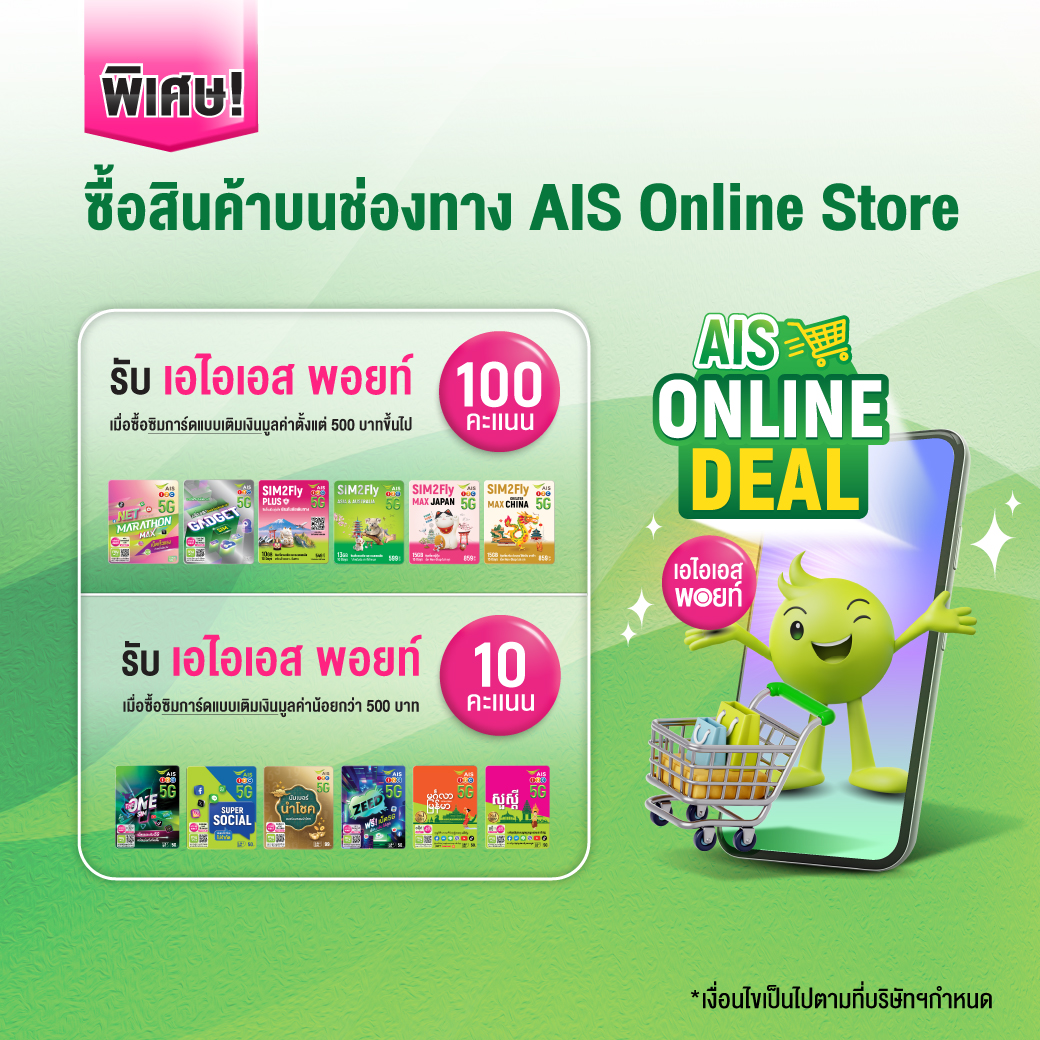 เงื่อนไขการมอบโค้ดส่วนลดบนเว็บไซต์ AIS Online Storeสิทธิ์การใช้โค้ดเป็นส่วนลด สำหรับแคมเปญ “AIS Online Deal” และลูกค้าสามารถใช้โค้ดได้ตั้งแต่วันที่ 1 เม.ย. 69 – 30 เม.ย. 69