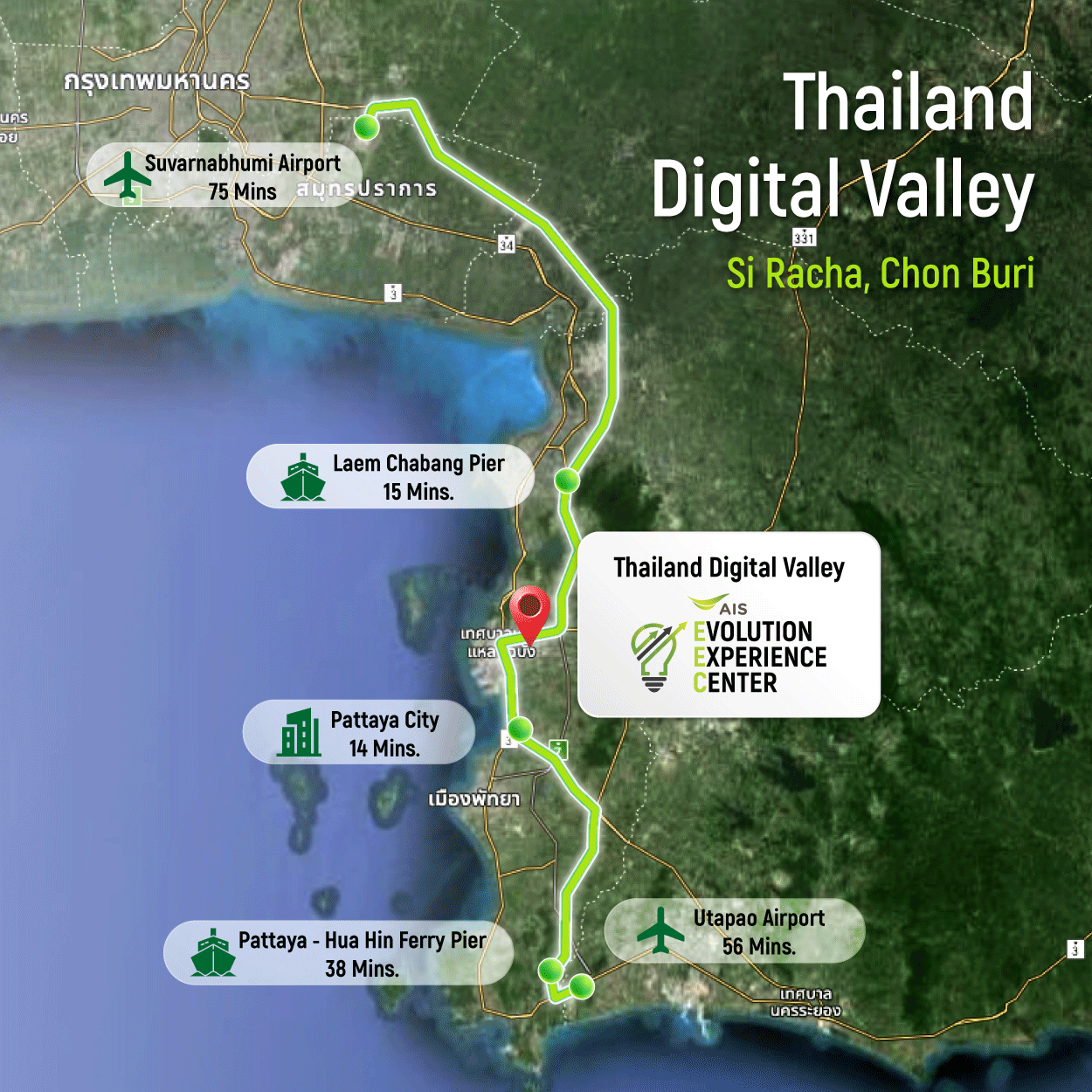 AIS EEC (Evolution Experience Center) - The Digital Evolution Center for Business, established by AIS Business, serves as a hub for digital technology and 5G for various industries. It is located within the Thailand Digital Valley in the Eastern Economic Corridor (EEC).
