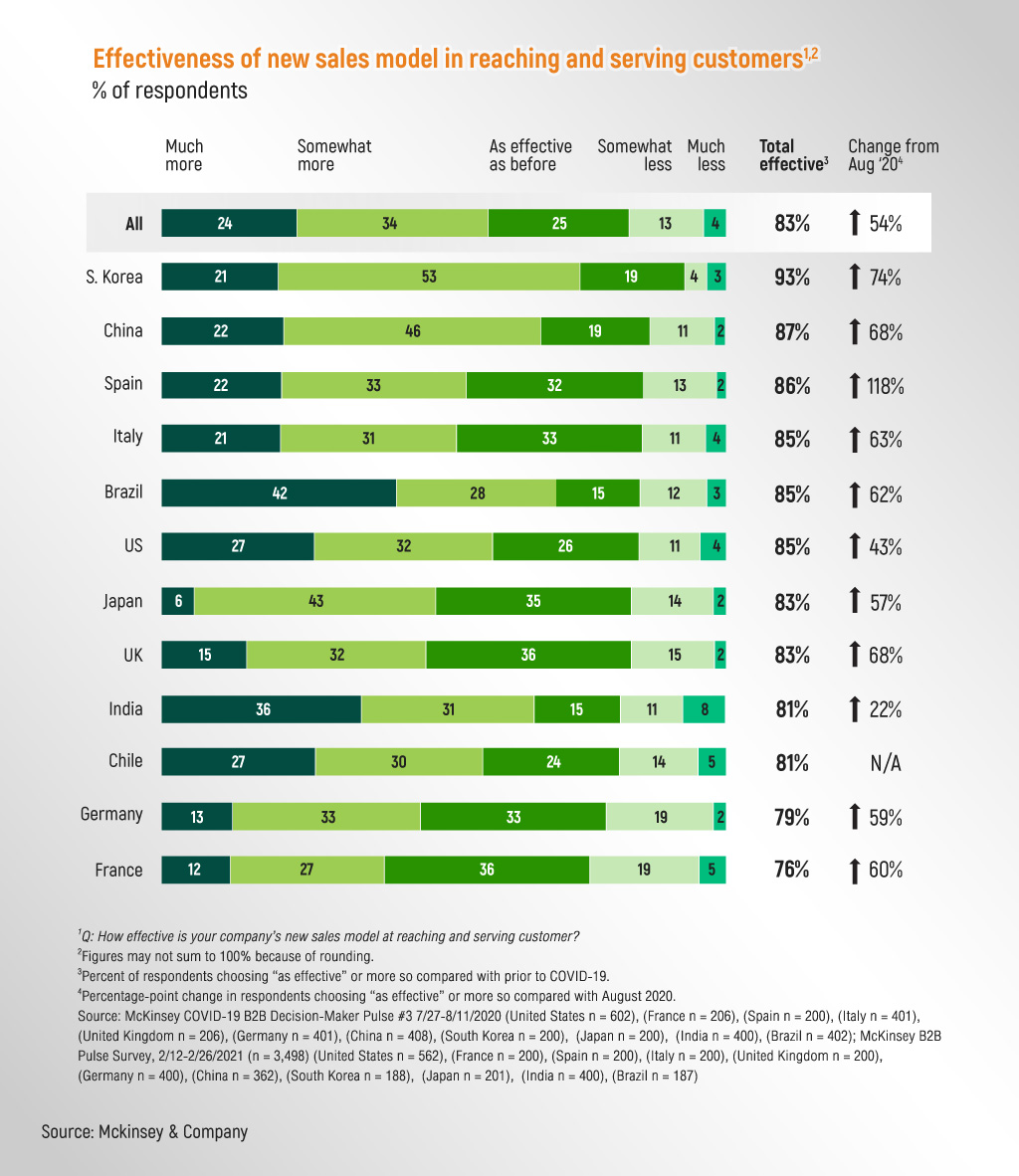 การนำเทคโนโลยีดิจิทัลเข้ามาช่วยบริหารจัดการระบบช่องทางการขายแต่ละช่องทางนั้น ทำให้การขายมีประสิทธิภาพมากขึ้น ช่วยลดขั้นตอน ลดความผิดพลาด รวมไปถึงลดต้นทุนทางธุรกิจลงไปได้อย่างมาก การบริหารจัดการช่องทางการขายเช่นนี้ไม่ใช่จะเกิดผลดีต่อธุรกิจแบบ B2C เท่านั้น แต่องค์กรธุรกิจขนาดใหญ่ที่เป็นแบบ B2B หากนำไปปรับใช้ก็จะเกิดผลดีต่อธุรกิจด้วยเช่นกัน โดย McKinsey ได้มีการทำการสำรวจในช่วงปี 2020 – 2021 ที่ผ่านมา องค์กรธุรกิจชั้นนำแบบ B2B ที่ทำการเปลี่ยนแปลงธุรกิจไปสู่ความเป็นดิจิทัลและนำเทคโนโลยีดิจิทัลเข้ามาช่วยบริหารจัดการเรื่องช่องทางการขายในธุรกิจตนเองนั้นพบว่าประสิทธิภาพของธุรกิจนั้นเพิ่มขึ้นอย่างรวดเร็ว จากระดับ 54% พุ่งขึ้นเป็น 83% ในช่วงระยะเวลาไม่กี่เดือน1