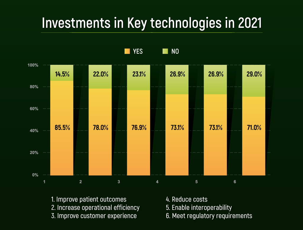 อ้างอิงจากรายงาน Enterprise ICT Investment Trends 2021 Healthcare Sector(1) ที่เผยแพร่มาในเดือนพฤศจิกายน 2021 ได้ระบุถึงผลสำรวจทางด้านเป้าหมายในการลงทุนทางเทคโนโลยีของอุตสาหกรรมการแพทย์และสาธารณสุขทั่วโลกเอาไว้ดังนี้