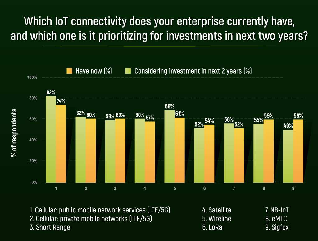 • ในปัจจุบัน มีการเลือกใช้ Public LTE/5G มากที่สุดด้วยสัดส่วน 82% และใช้งาน Private LTE/5G ที่ 62% ตามมาด้วย Short Range, Satellite, Wireline, LoRa, NB-IoT, eMTC และ Sigfox ตามลำดับ