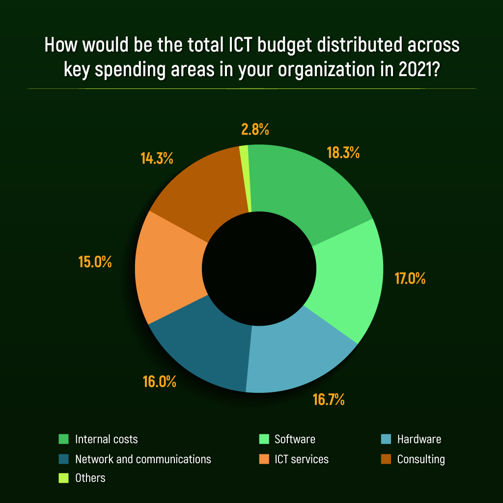 • ค่าใช้จ่ายในการลงทุนด้านระบบ Software ใหม่ 17.0% โดยมีการลงทุนในระบบ Application, Communication Software, Storage, Data Management & Analytics สูงสุดตามลำดับ