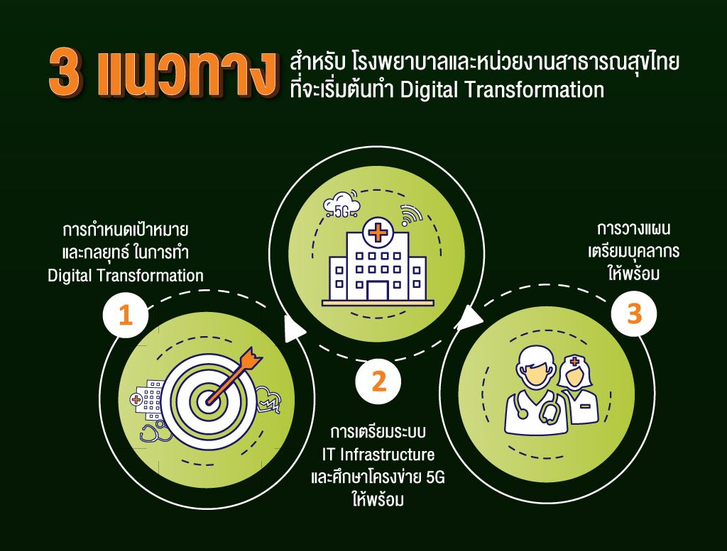 สำหรับโรงพยาบาลและหน่วยงานสาธารสุขไทยที่มีแผนด้านการทำ Digital Transformation สามารถเริ่มต้นเพื่อความสำเร็จในระยะยาวได้ด้วย 3 แนวทางดังนี้