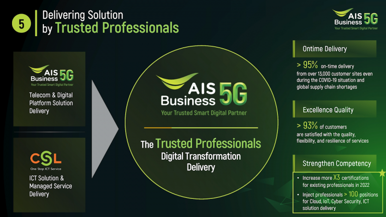 การควบรวมทีมงานของทั้ง AIS Business และ CSL ส่งผลให้ในวันนี้ AIS Business กลายเป็นผู้ให้บริการเพียงรายเดียวในประเทศไทยที่มีความพร้อมสูงสุดทั้งด้านโครงสร้างพื้นฐานทางโทรคมนาคม เครือข่ายอินเทอร์เน็ต เครือข่ายโทรศัพท์ และเครือข่ายเทคโนโลยีสมัยใหม่อย่าง AIS 5G และด้าน ICT มีทีมงานมืออาชีพที่ลูกค้ามอบความไว้วางใจได้ (The Trusted Professionals) พร้อมส่งมอบบริการรอบด้านแก่ธุรกิจองค์กรได้อย่างต่อเนื่อง แม่นยำ และมีประสิทธิภาพ ครอบคลุมตั้งแต่การให้คําปรึกษา ประเมิน ติดตั้ง บริหารโครงการ และบริการหลังการขายอย่างมืออาชีพ เพื่อช่วยให้ธุรกิจของลูกค้าเติบโตได้อย่างยั่งยืน
