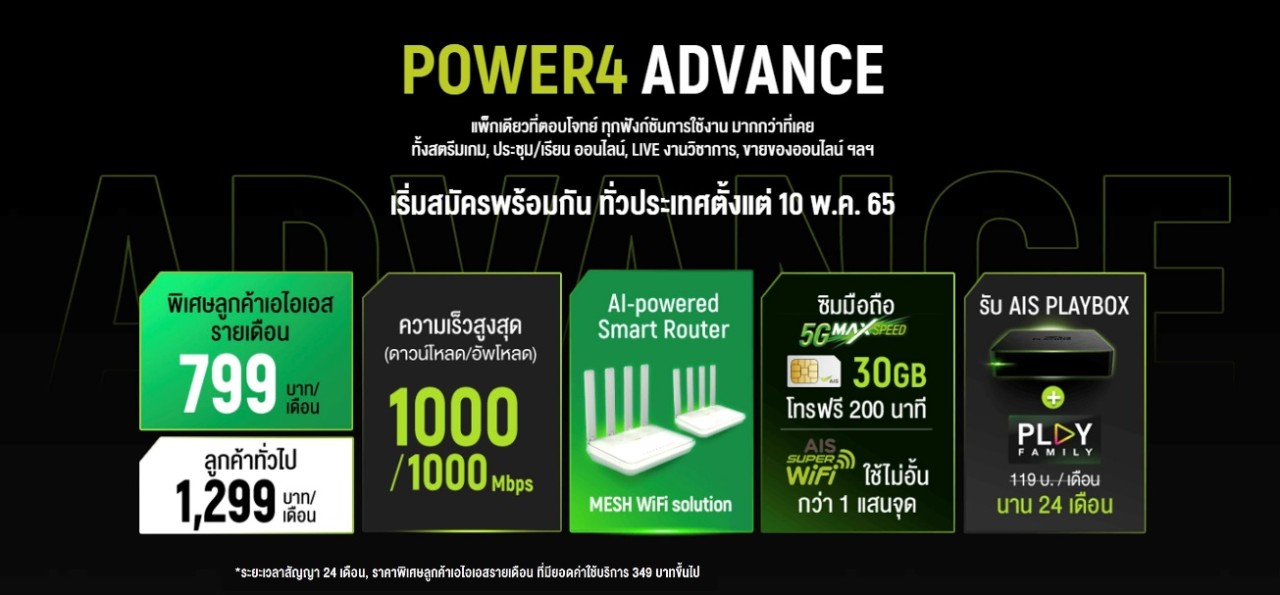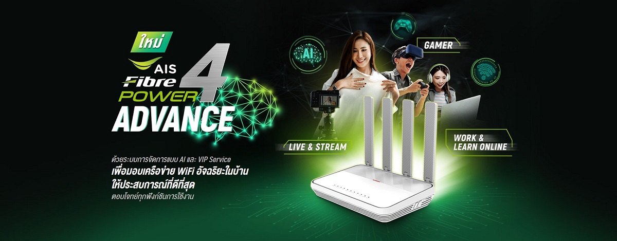 “เพื่อตอบโจทย์กลุ่มลูกค้า 3 กลุ่มหลัก ทั้งกลุ่ม Online Gamers ที่ให้ความสำคัญสูงสุดกับความเร็ว และค่า Latency กลุ่มที่ Work & Learn Online ที่ต้องการคุณภาพความคมชัดของภาพและเสียง ตลอดจนความเสถียรในการใช้งานต่อเนื่อง และกลุ่มผู้ที่ใช้งานหลักๆ จำพวก Streaming หรือ Live สดขายของออนไลน์ ที่ต้องการคุณภาพ และความเสถียร ให้ทุกการ LIVE ไม่ขาดตอน สตรีมมิ่งไม่มีสะดุด เราภูมิใจอย่างยิ่งที่ได้แนะนำนวัตกรรมล่าสุดนี้ให้แก่คนไทยเป็นรายแรกผ่าน แพ็กเกจ POWER4 Advance ที่จะมาพร้อมกับ อุปกรณ์รองรับเทคโนโลยี ใหม่ล่าสุด AI-powered Smart Router ให้ทุกท่านได้สัมผัสประสบการณ์เหนือระดับแบบ VIP ไปกับ Wi-Fi อัจฉริยะ ที่มาแบบเต็มสปีด ด้วยเน็ตบ้านความเร็วดาวน์โหลด/อัพโหลดสูงสุดถึง 1000Mbps (1Gbps) พร้อมทั้งซิมมือถือ AIS 5G กล่อง AIS PLAYBOX และContent Package แบบครบครัน ในราคาสุดคุ้ม