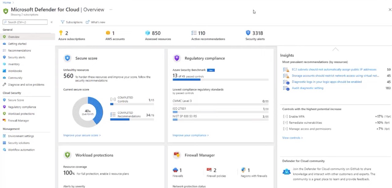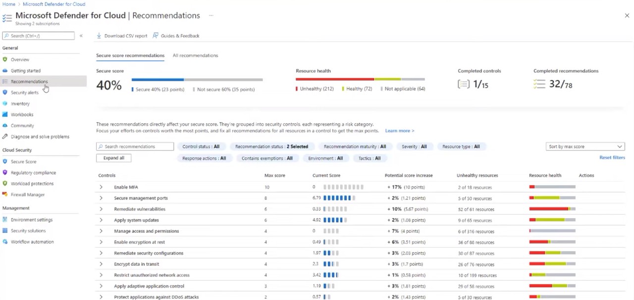 CSPM แจ้งปัญหาและความสำคัญให้กับผู้ใช้ด้วยระบบให้คะแนน หรือ Secure Score ที่เรียงตามลำดับความสำคัญของการปรับปรุงความปลอดภัยแบบต่างๆ ไมโครซอฟท์จะแสดงคำแนะนำให้ทำอะไรบ้างเพื่อแก้ไขความเสี่ยงแต่ละข้อ และความเสี่ยงของแต่ละข้อนั้นกระทบกับทรัพยากรใดในระบบไอทีขององค์กรบ้าง โดยฟีเจอร์ Secure Score นี้อยู่ในแพ็กเกจเบื้องต้นที่ใช้งานได้โดยไม่มีค่าใช้จ่าย