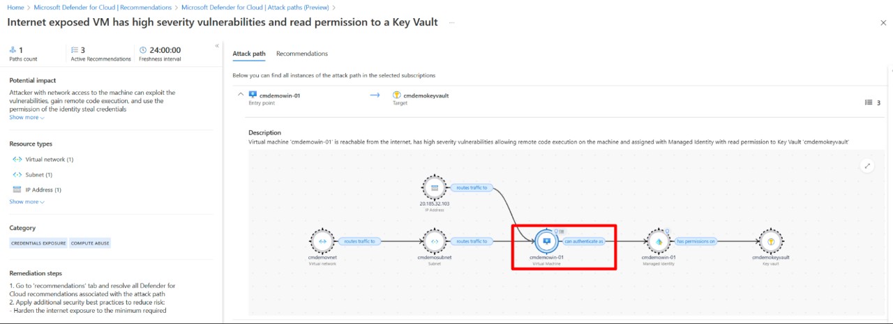 การวิเคราะห์เส้นทางการโจมตีที่มีความเสี่ยงสูง ทำให้ผู้ดูแลระบบสามารถโฟกัสกับการแก้ปัญหาส่วนที่มีความเสี่ยงสูงได้อย่างแม่นยำ เช่น เซิร์ฟเวอร์ที่มีสิทธิระดับสูง หรือระบบฐานข้อมูลที่มีข้อมูลสำคัญกลับเปิดรับการเชื่อมต่อจากอินเทอร์เน็ตโดยตรง ฟีเจอร์ Attack path analysis ของ CSPM ก็สามารถวิเคราะห์ความเสี่ยงเหล่านี้ออกมาให้ผู้ดูแลเห็นภาพได้ทันที