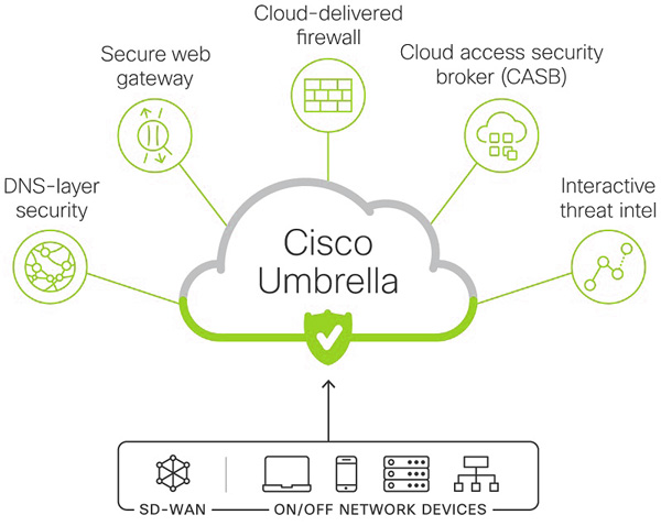 Cisco Umbrella เป็นโซลูชันที่เริ่มต้นจากระบบ DNS Security ที่จะช่วยปกป้องผู้ใช้งานจากการเชื่อมต่อไปยัง Domain Name ที่อาจมีความเสี่ยงหรือเป็นอันตรายแก่ผู้ใช้งานอย่างได้ผลไม่ว่าผู้ใช้งานจะอยู่ที่ใด จนกระทั่งในภายหลัง Cisco Umbrella ก็ได้เริ่มถูกพัฒนาต่อยอดไปสู่การเป็นโซลูชัน SASE อย่างเต็มตัว เพื่อปกป้องผู้ใช้งานได้ด้วยแนวทางที่หลากหลายมากยิ่งขึ้น ได้แก่