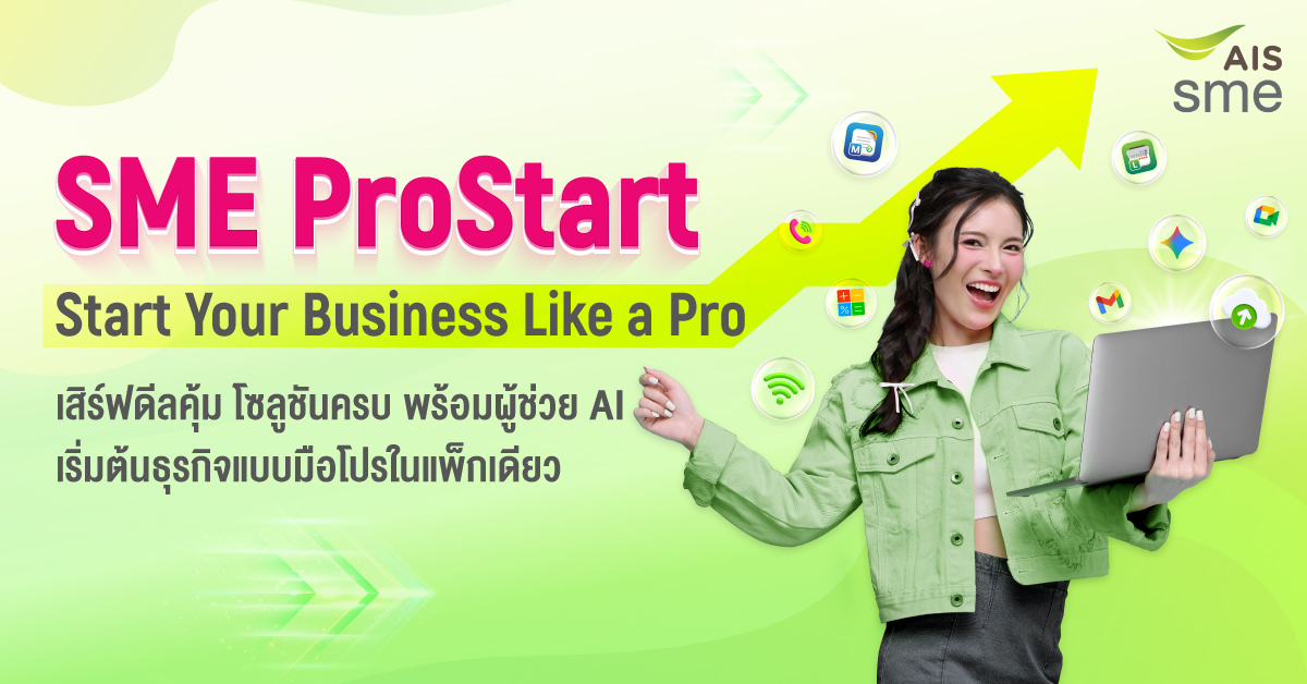 เสิร์ฟดีลคุ้ม โซลูชันครบ พร้อมผู้ช่วย AI ให้คุณเริ่มต้นธุรกิจแบบมือโปรในแพ็กเดียว เริ่มต้นธุรกิจให้พร้อมตั้งแต่ก้าวแรกด้วย SME ProStart แพ็กเกจที่ออกแบบมาเพื่อคนทำธุรกิจยุคใหม่ รวมทุกสิ่งที่จำเป็นต่อการเริ่มต้นและขับเคลื่อนธุรกิจไว้ในแพ็กเดียว พร้อมรับสิทธิพิเศษบริการสนับสนุนธุรกิจเพิ่มเมื่อสมัครบริการ ช่วยให้คุณโฟกัสกับการเติบโตของธุรกิจได้อย่างมั่นใจ