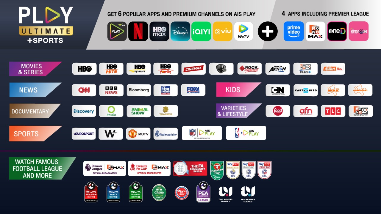 - PLAY ULTIMATE package is for simultaneous use on 4 screens at the same time per account. Customers can stream via Website https://aisplay.ais.co.th/portal, Apple TV, Samsung Smart TV and Chromecast to watch on a big screen or via AIS PLAY APP through App Store and Google Play Store. Android 4.4 and iOS 10.2 are the minimum supported versions.