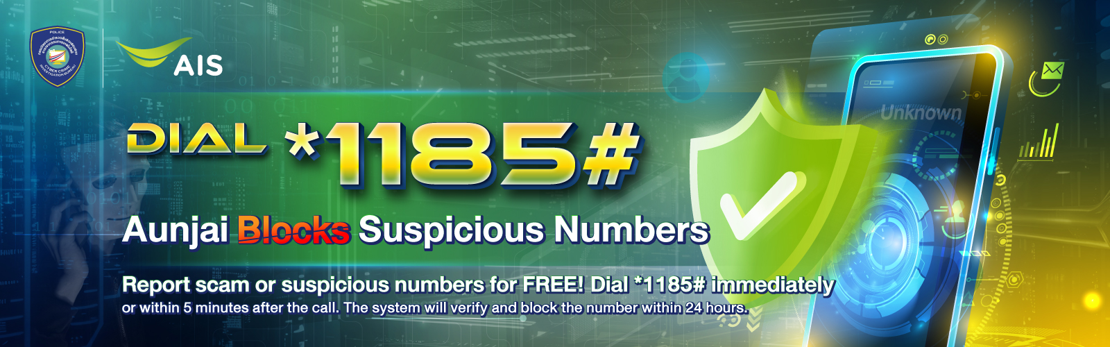*1185# service is a USSD service customers to report suspicious phone numbers that may be linked to scams quickly. AIS will forward the data to the Central Investigation Bureau (CIB)
