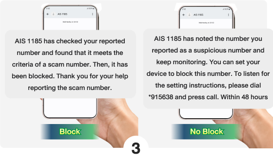 After ending the call with the suspicious number, within 5 minutes, dial *1185# and press call to report the number. AIS will verify the latest call and send the information to the Central Investigative Bureau. Customers will receive SMS updates on the investigation results within 48 hours.